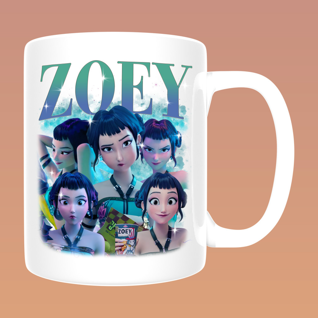 Ez a bögre a HUNTRIX világának egyik legkarakteresebb szereplőjét, ZOEY-t állítja reflektorfénybe. A dizájn középpontjában a nagy, lila-kék árnyalatú „ZOEY” felirat áll, amely vizuálisan kiemeli a karakter nevét. A grafika több Zoey-változatot jelenít meg – különböző pózokban, arckifejezésekkel és outfitekkel, mintha egy karakterfejlődési montázst látnánk.